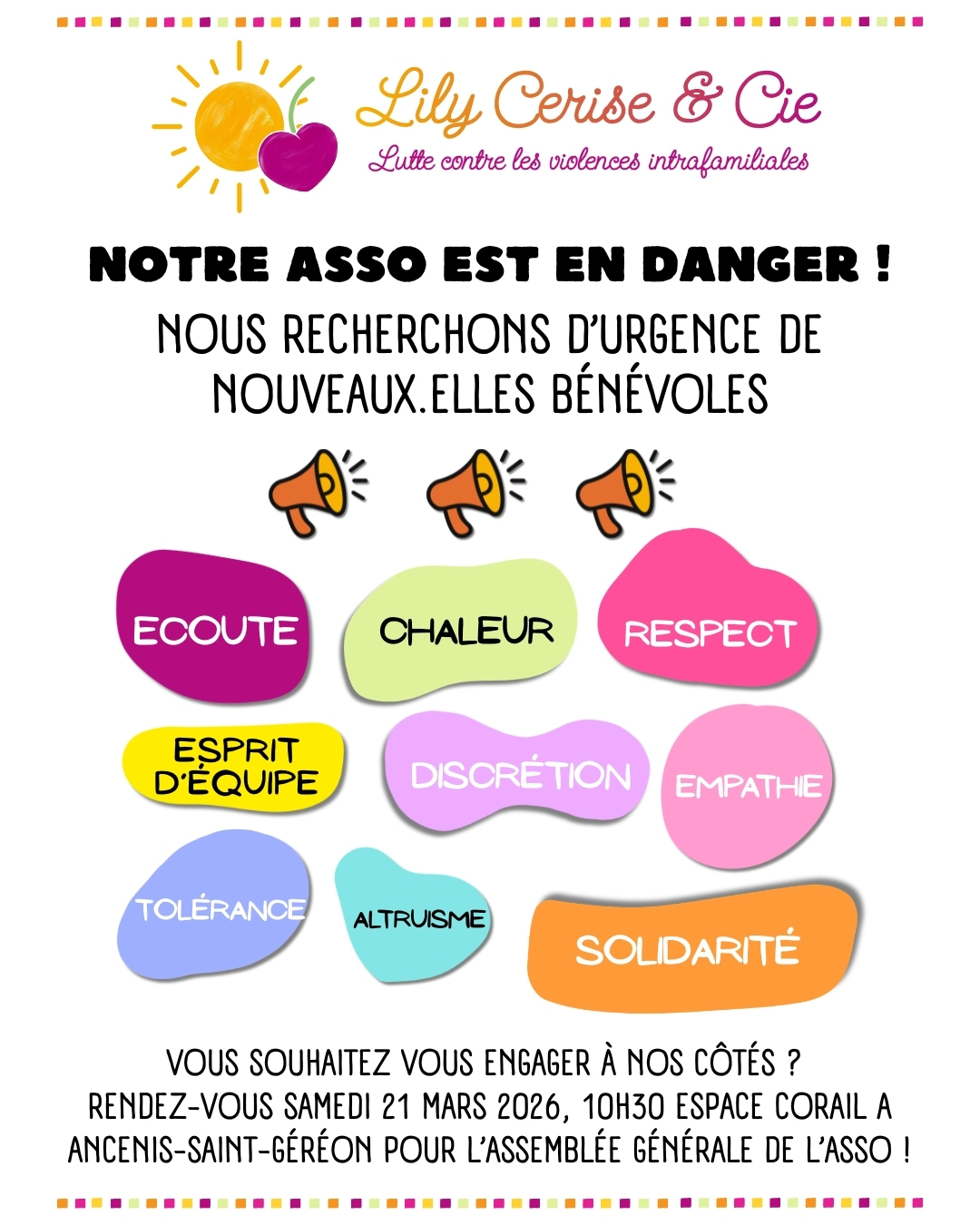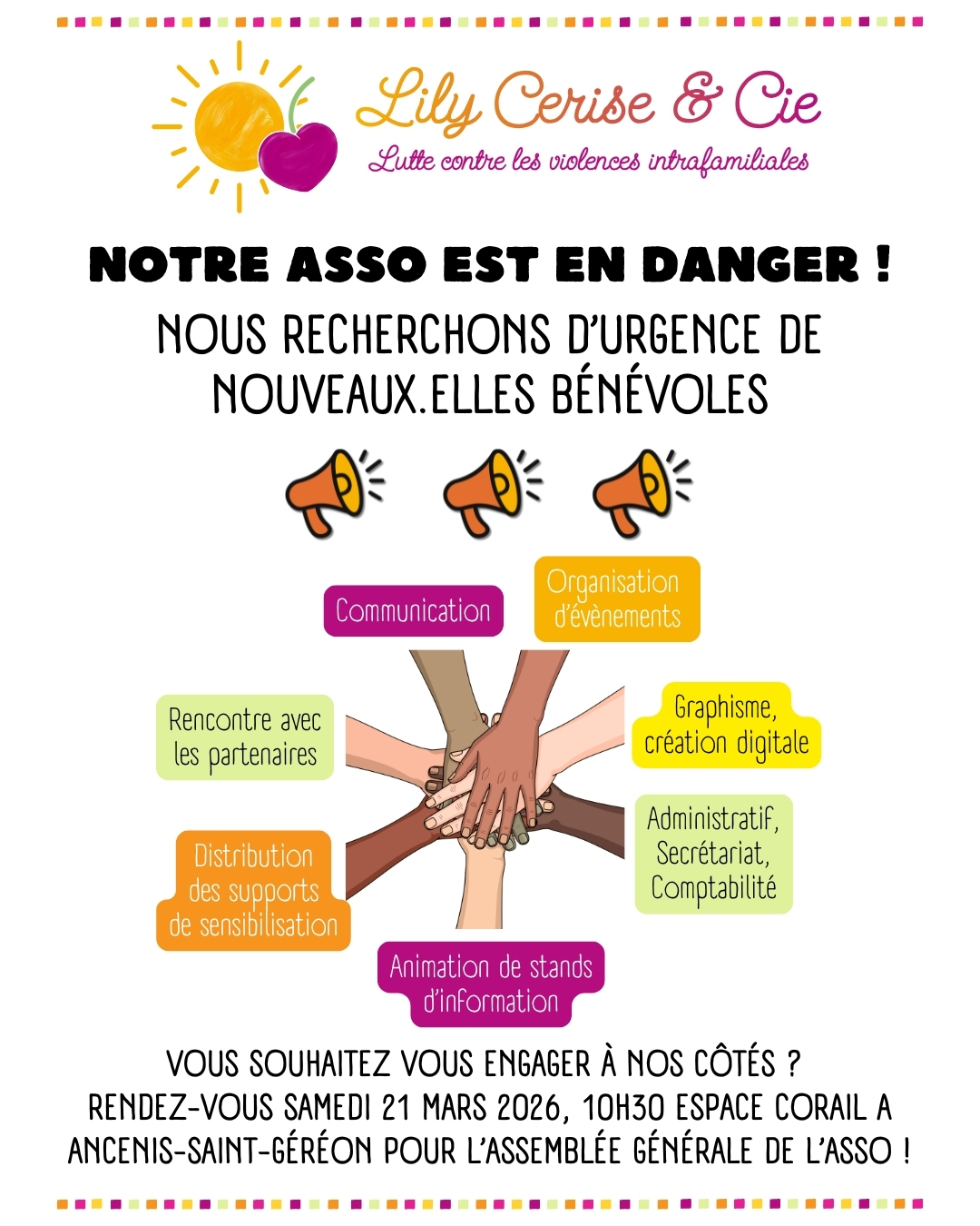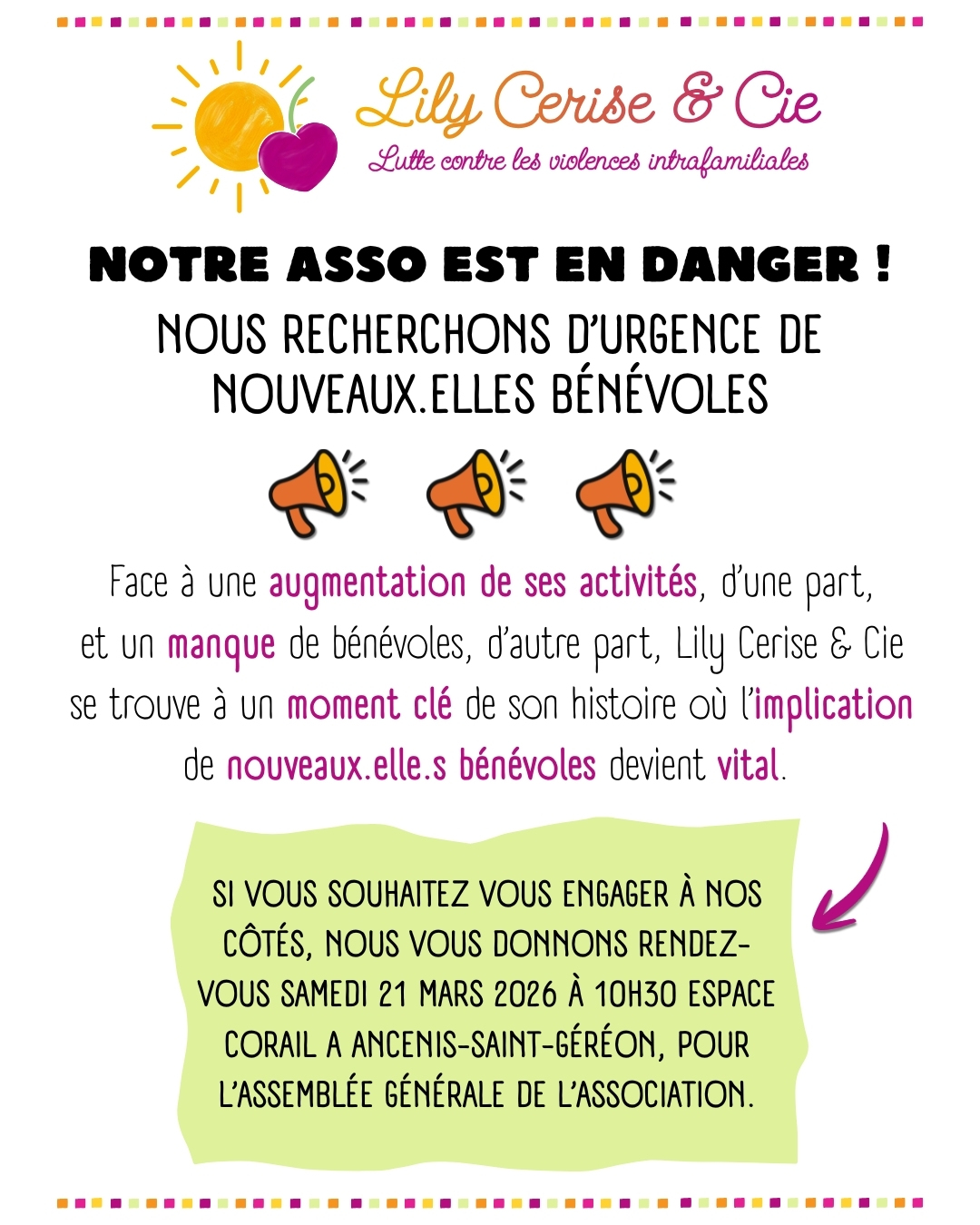 Nous rappelons que les missions de l’association Lily Cerise & Cie sont d’apporter des informations concrètes aux victimes, témoins, auteurs et autrices de violences, sensibiliser et prévenir les violences conjugales et familiales en donnant des clés pour agir, écouter et orienter si besoin.
